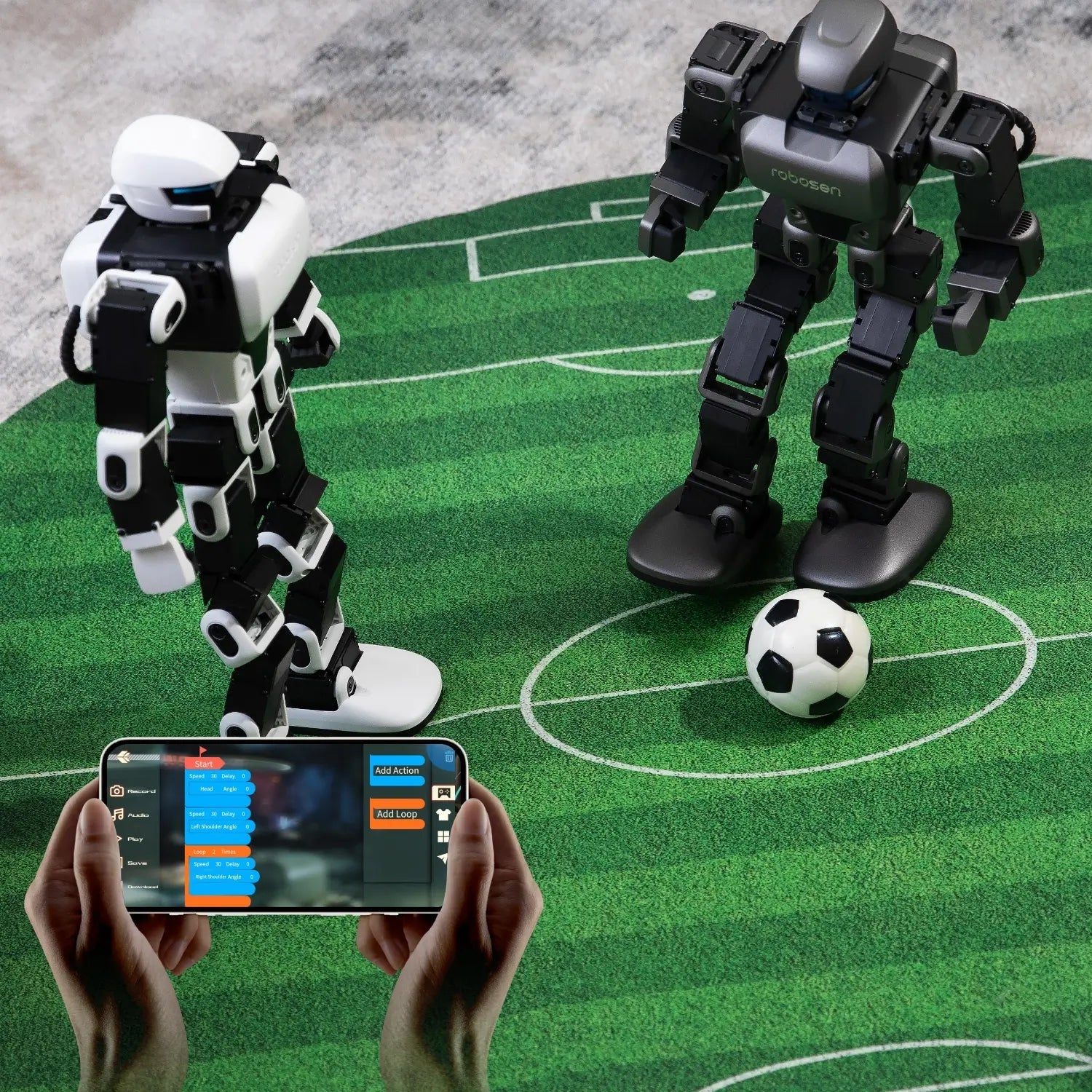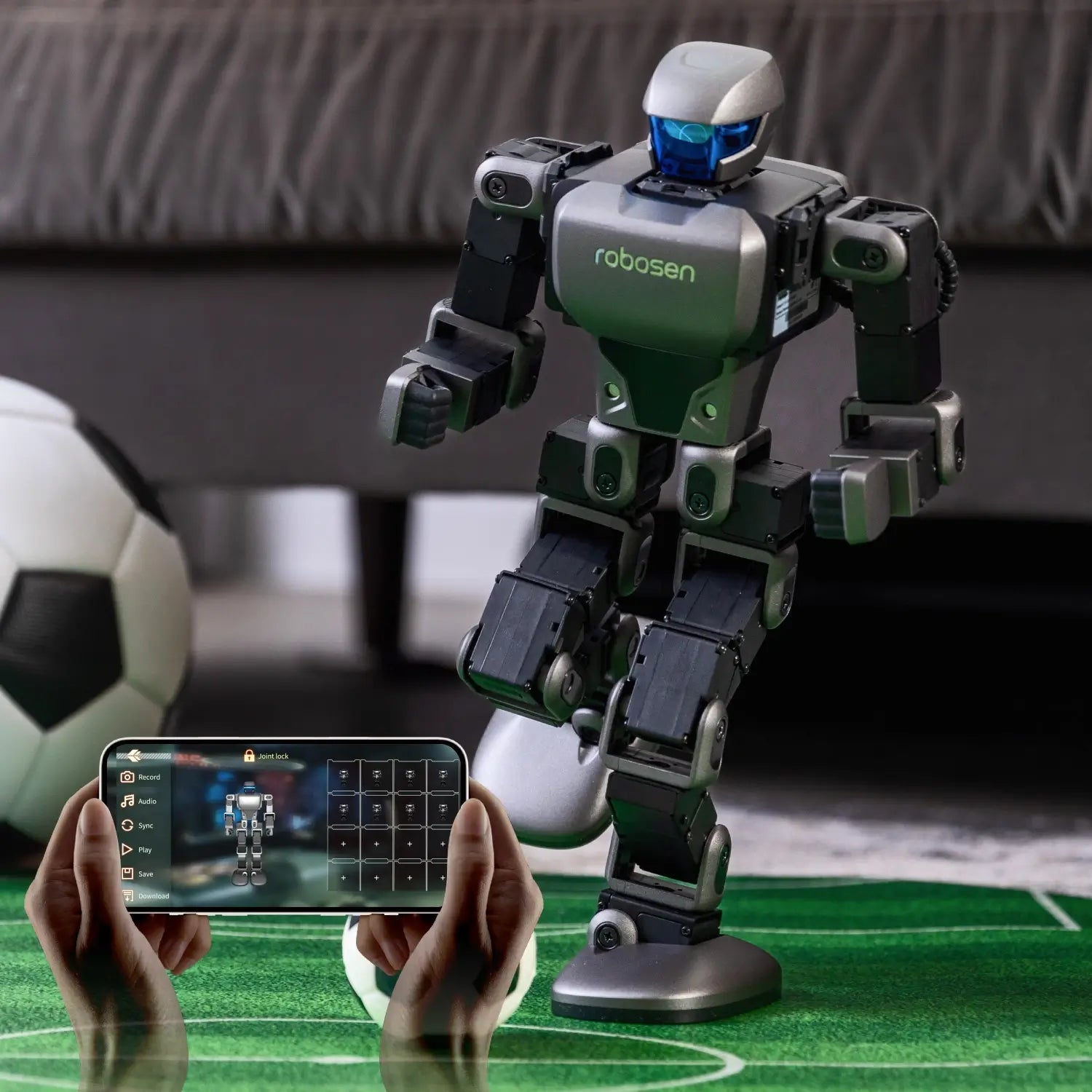 Communication Method: Aluminum alloy frame structures,17 servo motors (Head ×1/Hands 3×2/Legs 5×2)