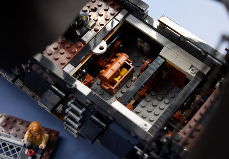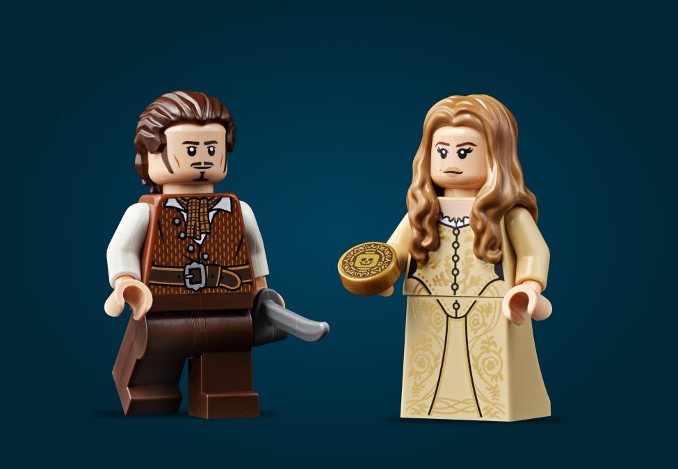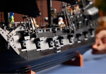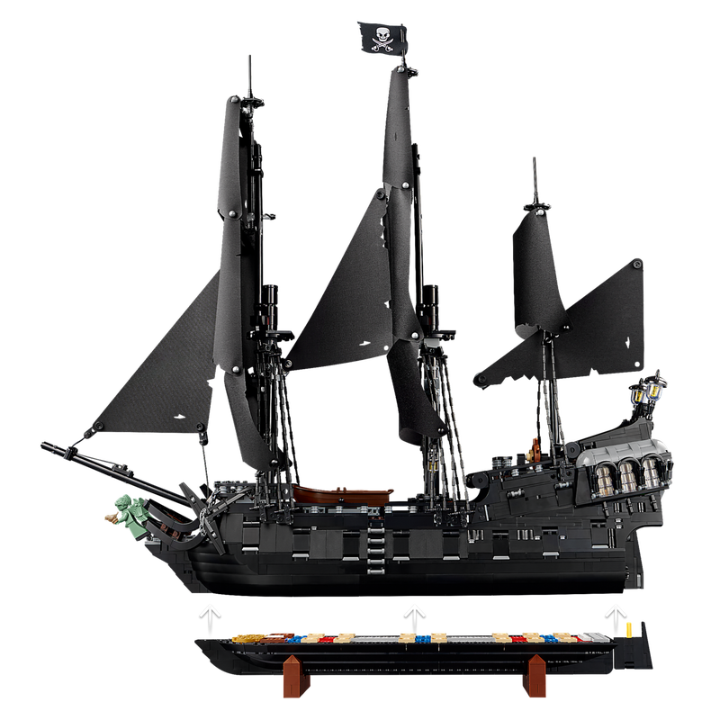 This film replica model captures the ship in all its glory. Rotate dials to deploy the port or starboard cannons, turn the ship’s wheel to steer the rudder and open the deck to reveal the captain’s quarters with furnishings, candlesticks and an apple. Additional features include a detachable rowing boat, a figurehead minifigure and a versatile stand for angled display. Alternatively, the hull can be split at the waterline to depict the ship in sailing mode.