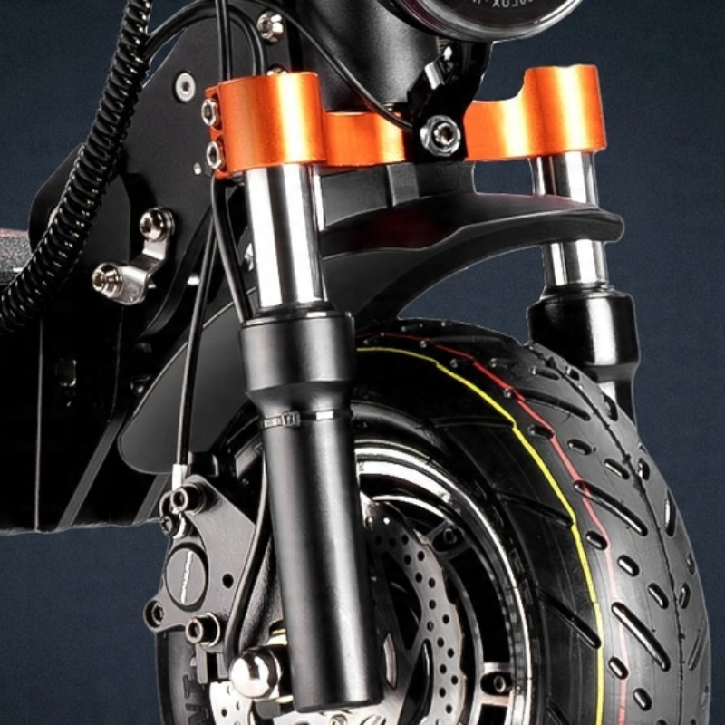 Equipped with front and rear dual-piston hydraulic disc brakes combined with E-ABS electronic braking, this system ensures reliable stopping power in all weather conditions. Features a large 140mm all-steel brake disc for enhanced durability and performance.