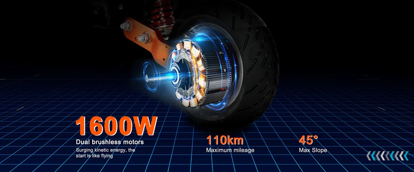 The 3200W dual-hub motor can easily handle 45° climbing, with stable power, fast acceleration and low noise.